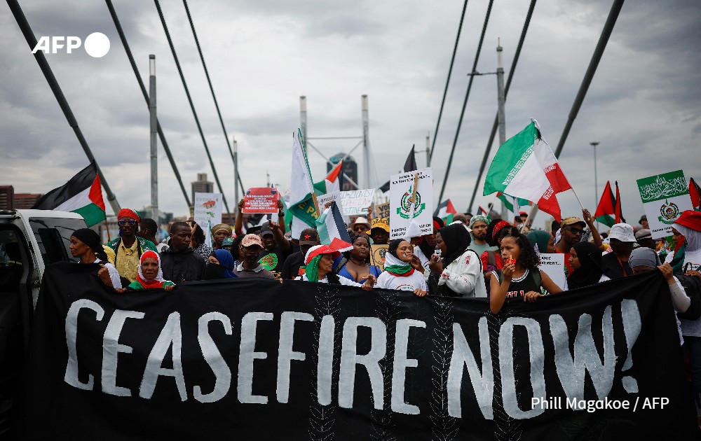 Demonstrators carry a banner during a pro-Palestinian demonstration by various political parties and trade unions in Johannesburg on November 29, 2023.