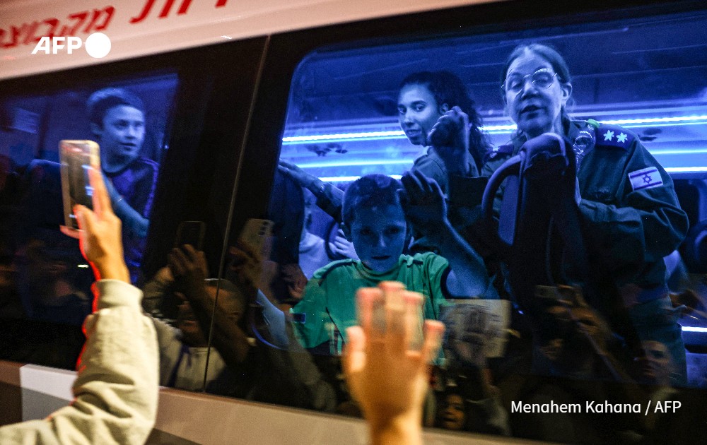 Hostages Gal and Tal Almog-Goldstein stand in a bus headed to an army base in Ofakim, southern Israel, following their release by Hamas from the Gaza Strip on November 26, 2023