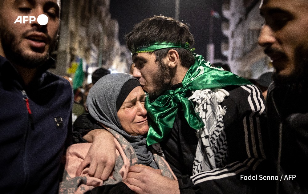 A Palestinian prisoner embraces his mother upon release from an Israeli jail in exchange for hostages freed by Hamas in the Gaza Strip. Ramallah, occupied West Bank, November 26, 2023.