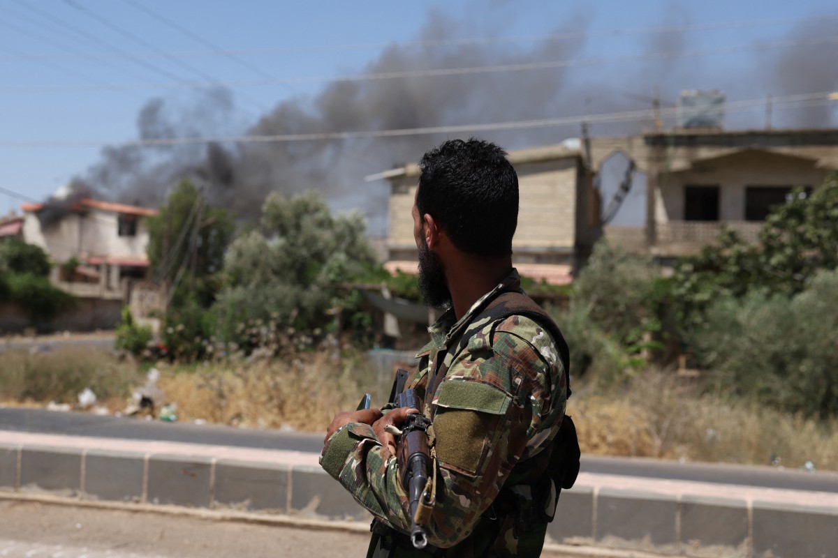(1) Un membre des forces de sécurité syriennes, à Soueida le 15 juillet 2025. Les forces gouvernementales syriennes sont entrées dans la ville à majorité druze de Soueida le 15 juillet 2025, a indiqué le ministère de l’Intérieur, dans le but de mettre fin aux affrontements avec les tribus bédouines qui ont fait près de 100 morts. © Bakr Alkasem / AFP
