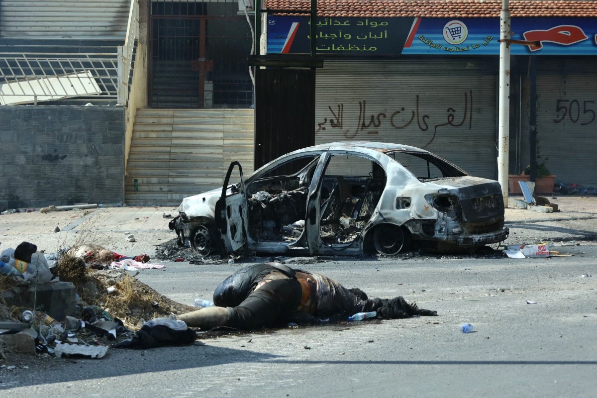 (2) Attention, contenu sensible : des corps de personnes tuées lors des violences sectaires de la semaine précédente gisent dans une rue de Soueida, le 20 juillet 2025. © Shadi Al Dubaisi / AFP