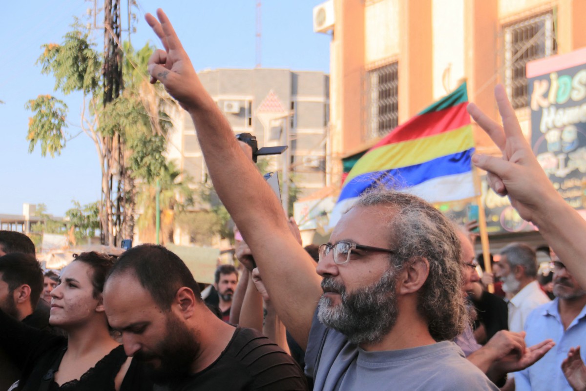 (1), (2), (3) Des Syriens se rassemblent pour protester contre la situation humanitaire à Soueida, le 28 juillet 2025. Un nouveau convoi d’aide humanitaire est arrivé le 28 juillet, selon les médias officiels, alors que les Nations unies ont averti que la situation humanitaire dans la province de Soueida était critique. © Shadi Al Dubaisi / AFP