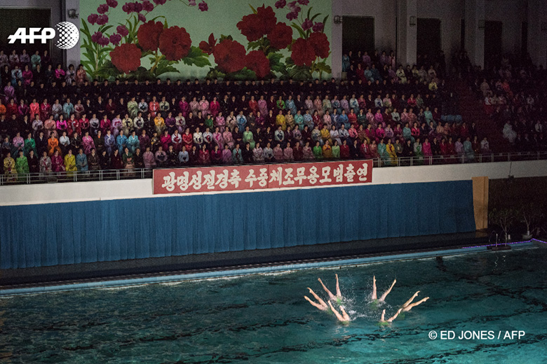 15 février 2017 – Corée du Nord, Pyongyang – Des spectateurs assistent à un gala de natation synchronisée. © ED JONES / AFP PHOTO