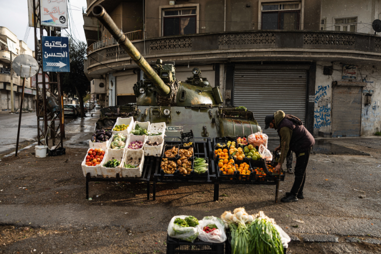 Sameer Al-Doumy reçoit la deuxième place pour une image prise à Homs en Syrie le 20 décembre 2024, montrant un Syrien vendant des légumes devant un char et les décombres d’un immeuble, après que les rebelles islamistes ont renversé le président Bachar al-Assad en décembre 2024.
