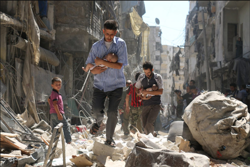 Ces deux bébés sont des petites filles. Elles sont vivantes. Les hommes qui les tiennent avec tendresse dans leurs bras protecteurs, comme le plus précieux des trésors, sont leurs pères. Ils courent les amener à l’hôpital. Ils fuient la scène de bombardement. Cette photo a été prise à Alep le 11 septembre 2016 par Ameer Al Halbi, 21 ans, photographe syrien indépendant qui travaille pour l’AFP depuis 2013. Il était âgé alors de 18 ans. Lire l'article de Polka