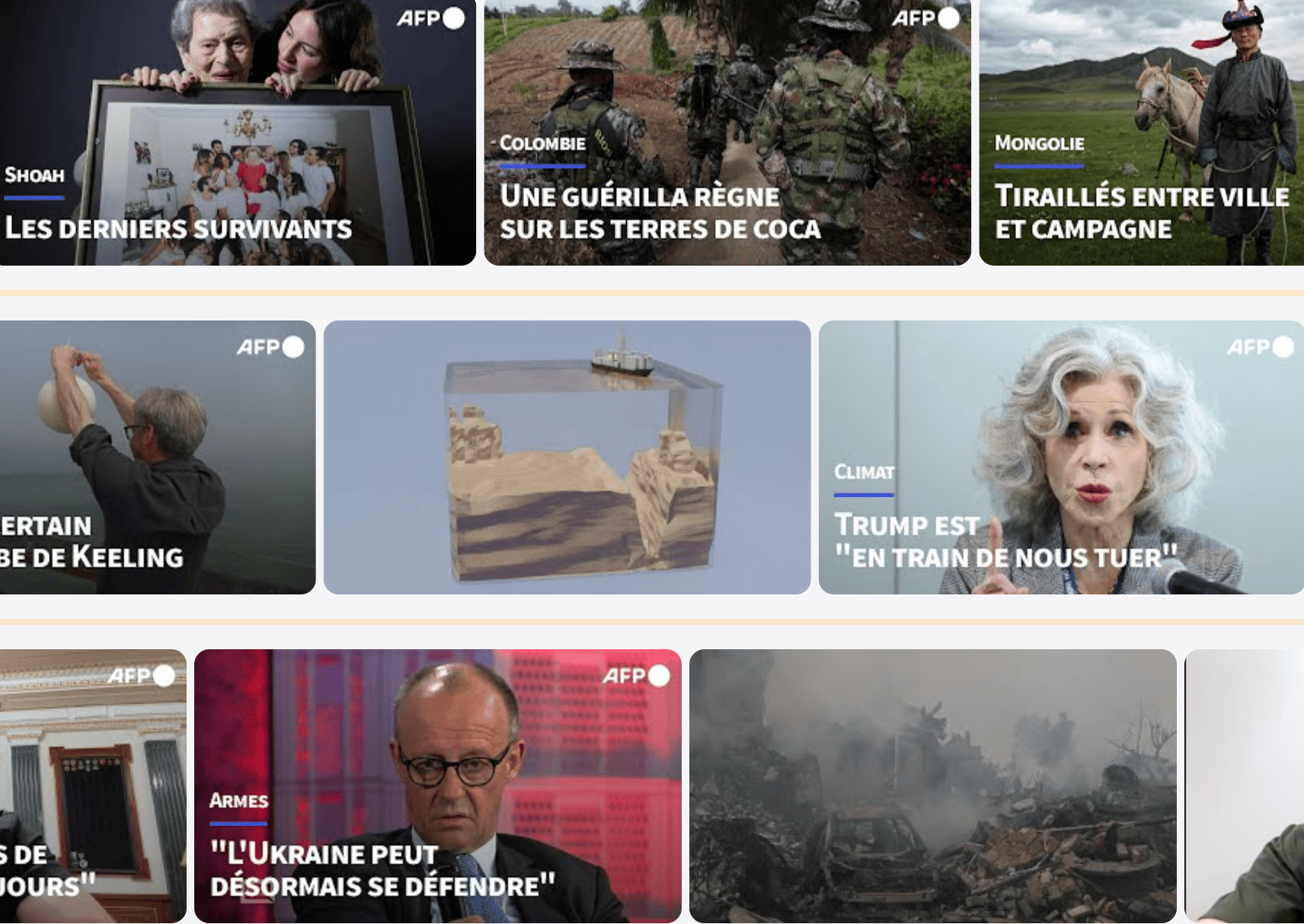 Avec un réseau mondial de plus de 1 700 journalistes, l'AFP offre une couverture sur le terrain inégalée, des histoires humaines et des reportages uniques. La production de l'AFP porte sur un large éventail de sujets : conflits géopolitiques, intelligence artificielle, droits des femmes, thématiques LGBTQ+, crise climatique... grâce à des drones et des caméras de haute qualité, qui élèvent notre production vers de nouveaux sommets.