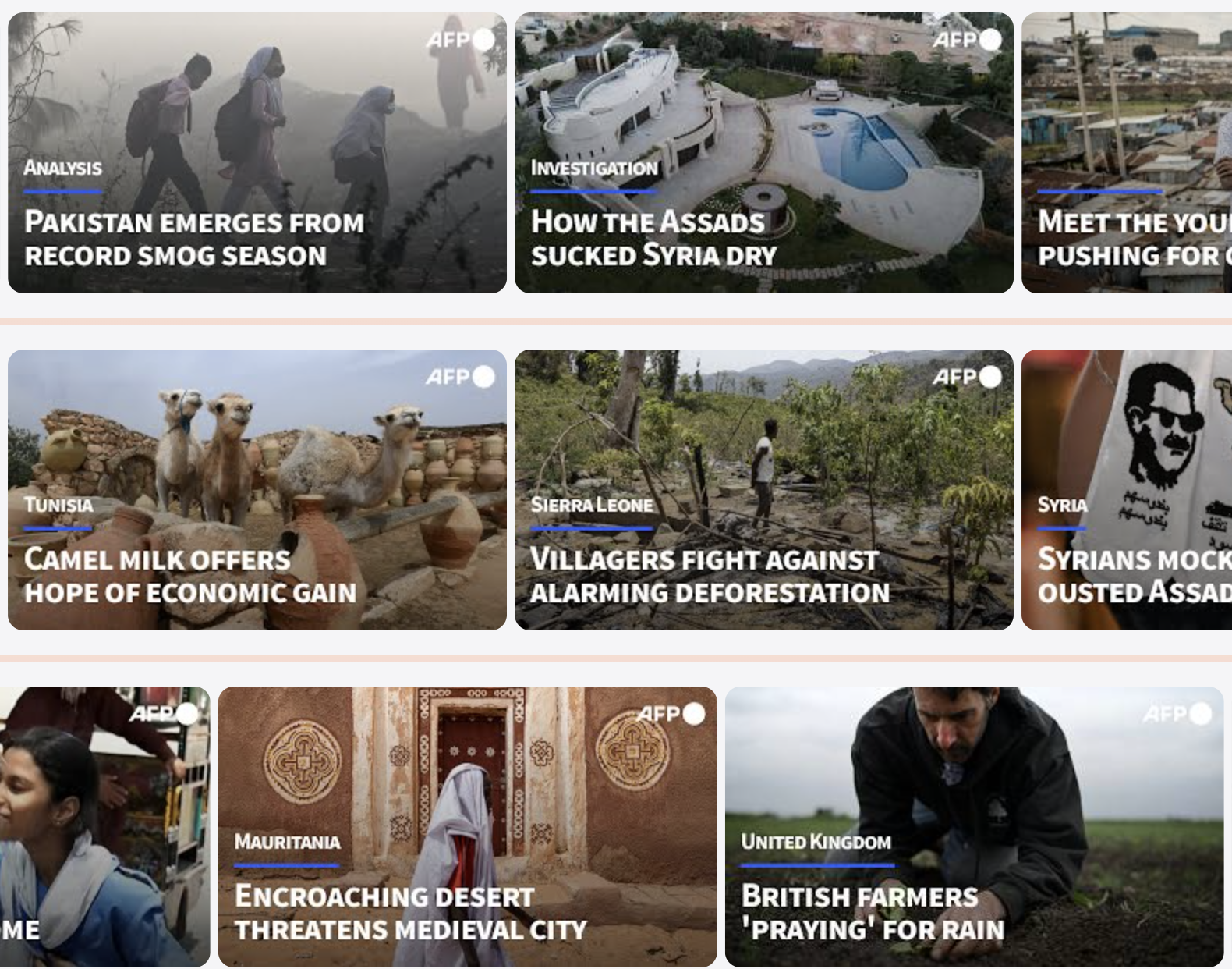 Com uma rede global de mais de 1.700 jornalistas, a AFP oferece uma cobertura ampla, direto do front, oferecendo aos seus clientes imagens e reportagens em tempo real, com histórias exclusivas e com foco nas pessoas. Com uma gama diversificada de temas, incluindo conflitos armados na Ucrânia e no Oriente Médio, inteligência artificial, empoderamento das mulheres, questões LGBTQ+ e a crescente crise climática, a extensa cobertura da AFP também utiliza drones e equipamentos de última geração para elevar a narrativa a novos patamares.